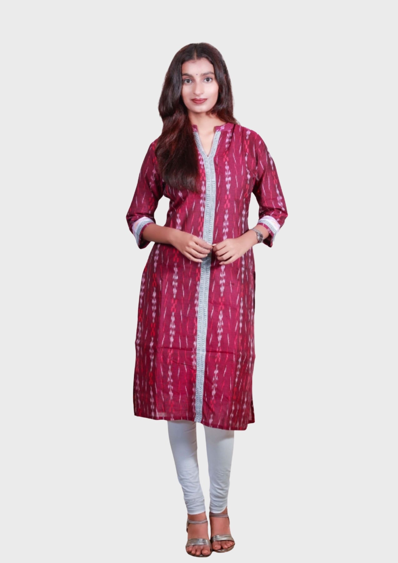 Sambalpuri Women's Kurti - High Neck Lace-work Kurta in Magenta