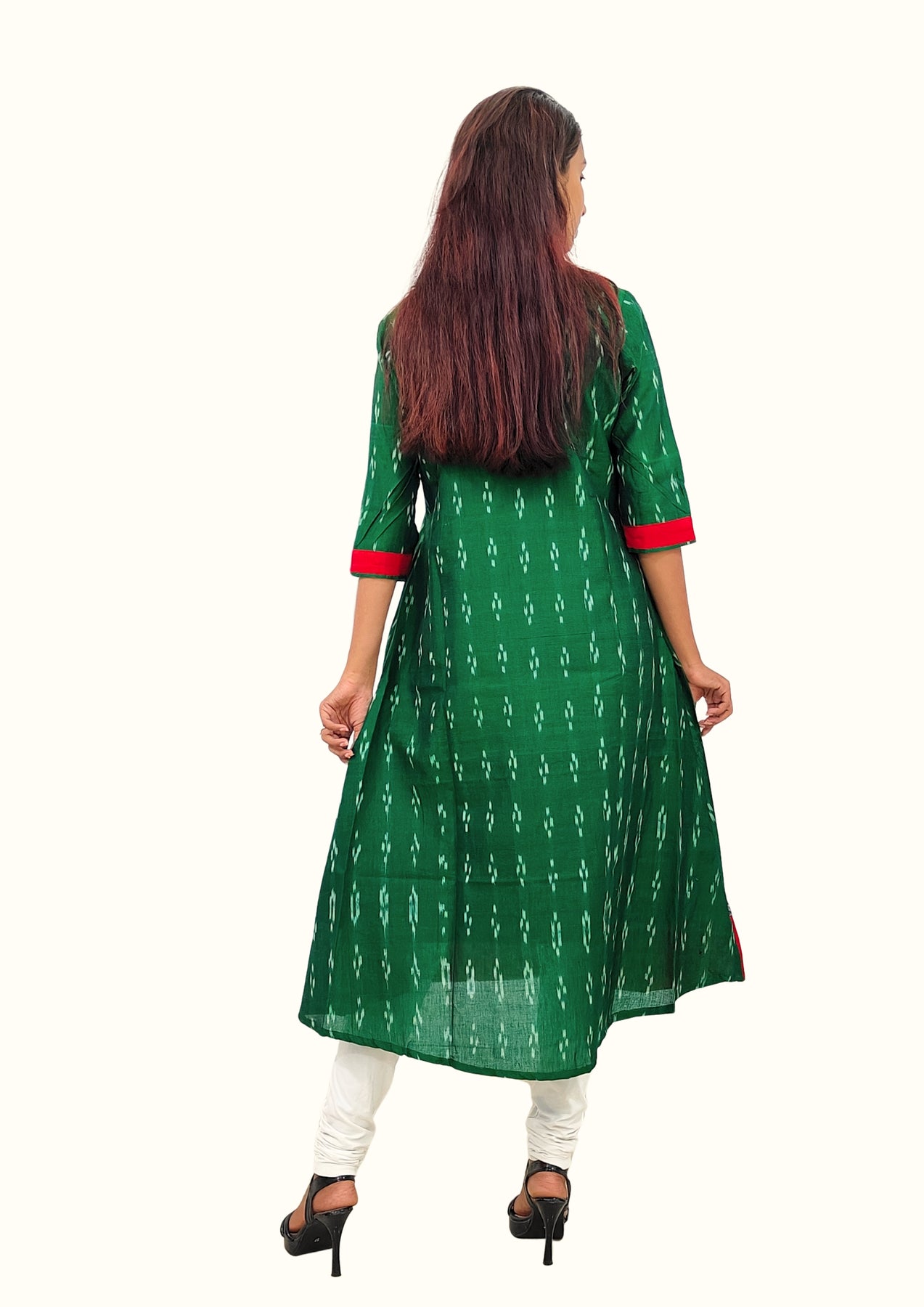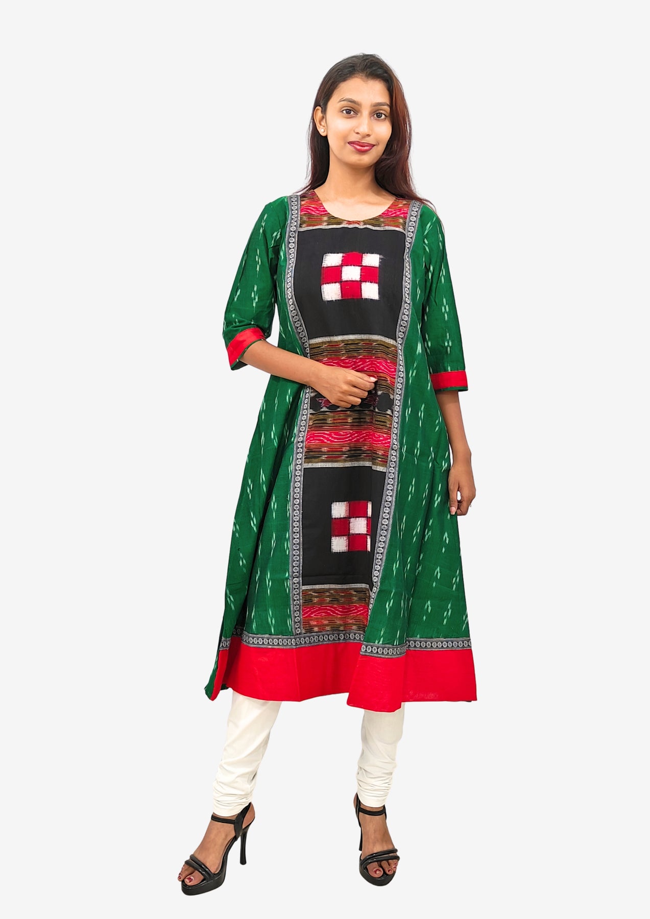 Sambalpuri Women’s Gown – Green with Black Ikat Panel and Red-White Checkered Motif