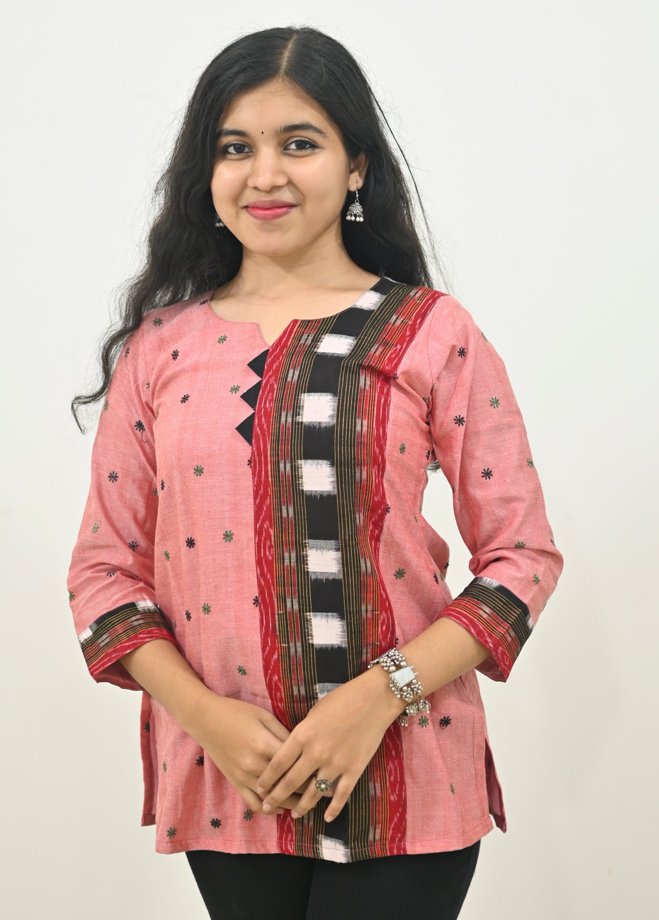 Wovio Modern Ikat Fusion Top V Neck – Pink Base with Mini Dot Motifs & Red– Black