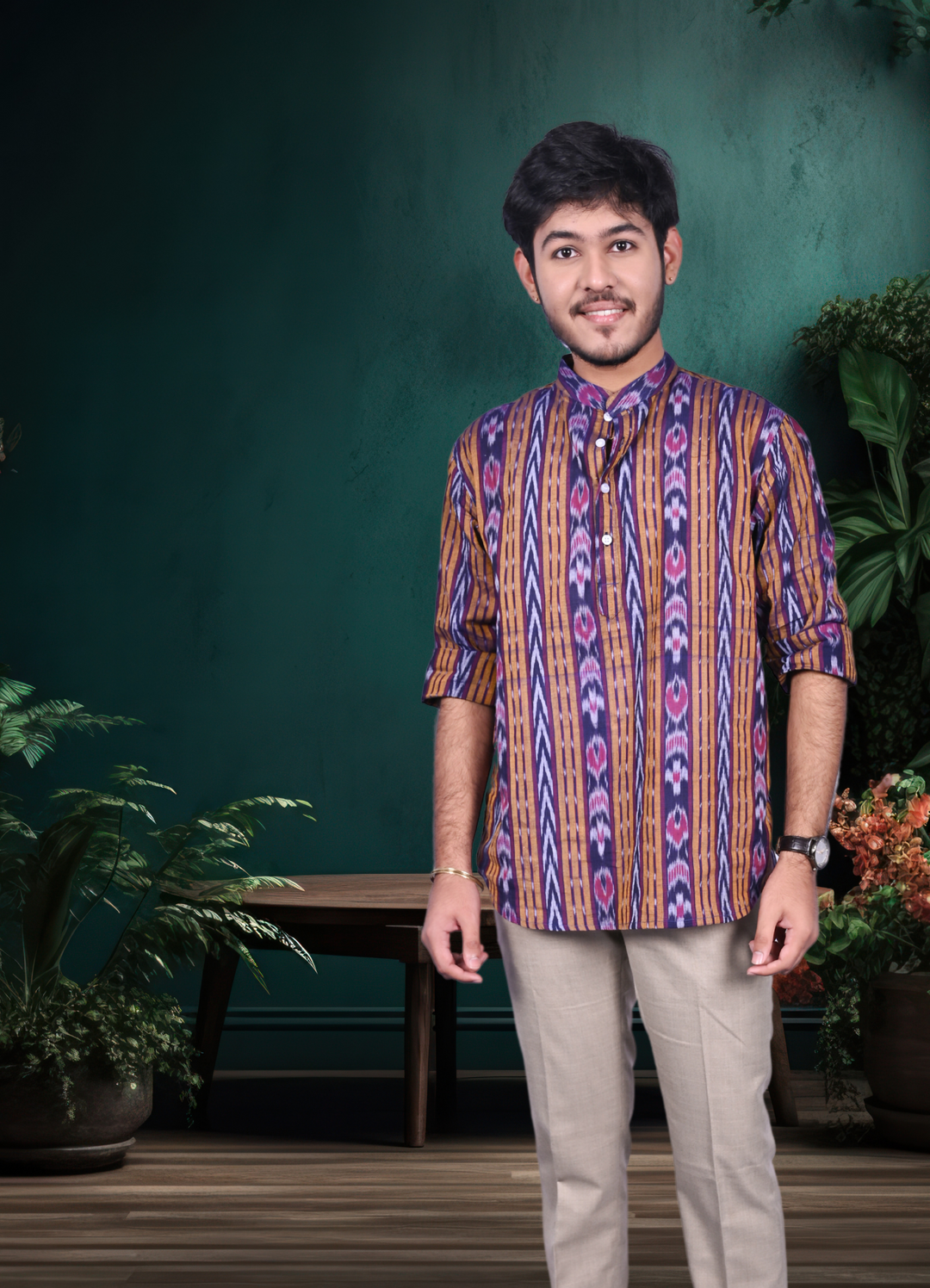 Sambalpuri Handloom Cotton Full-sleeve Short Kurta for Men in Violet
