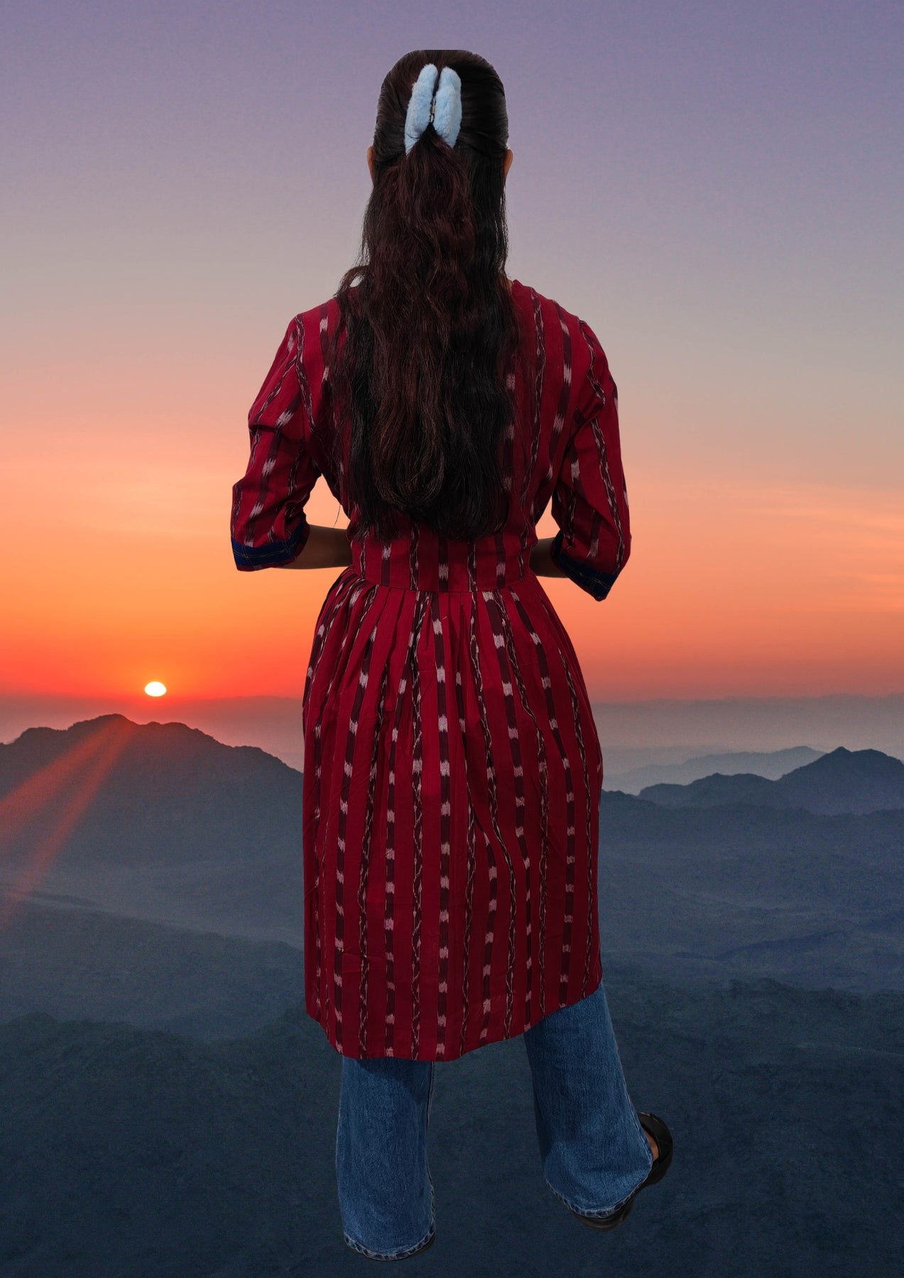 Rudvika – Red & Blue Naira-Cut Frock with Artistic Ikat Detailing