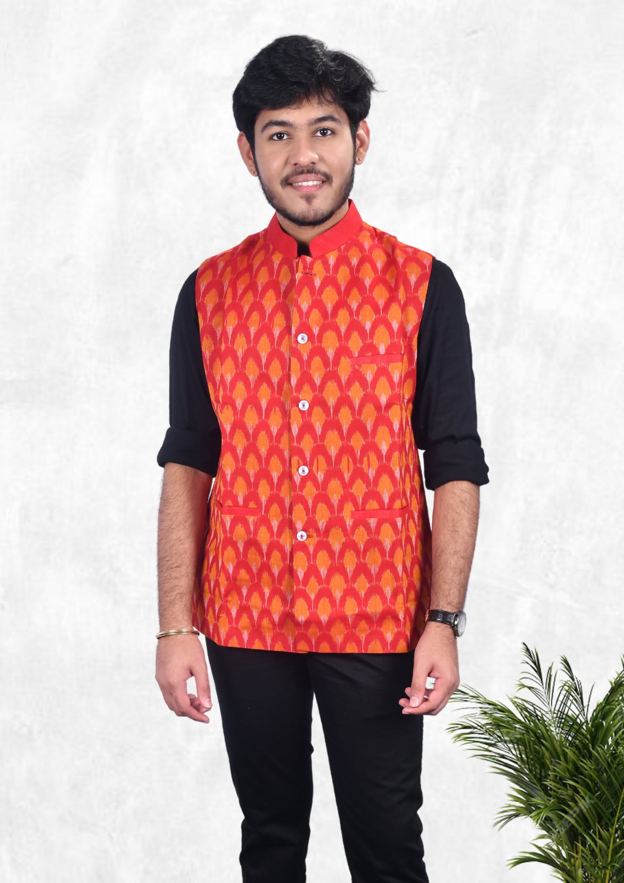 Hand-woven Sambalpuri Pure Cotton Men's Half Jacket in Red