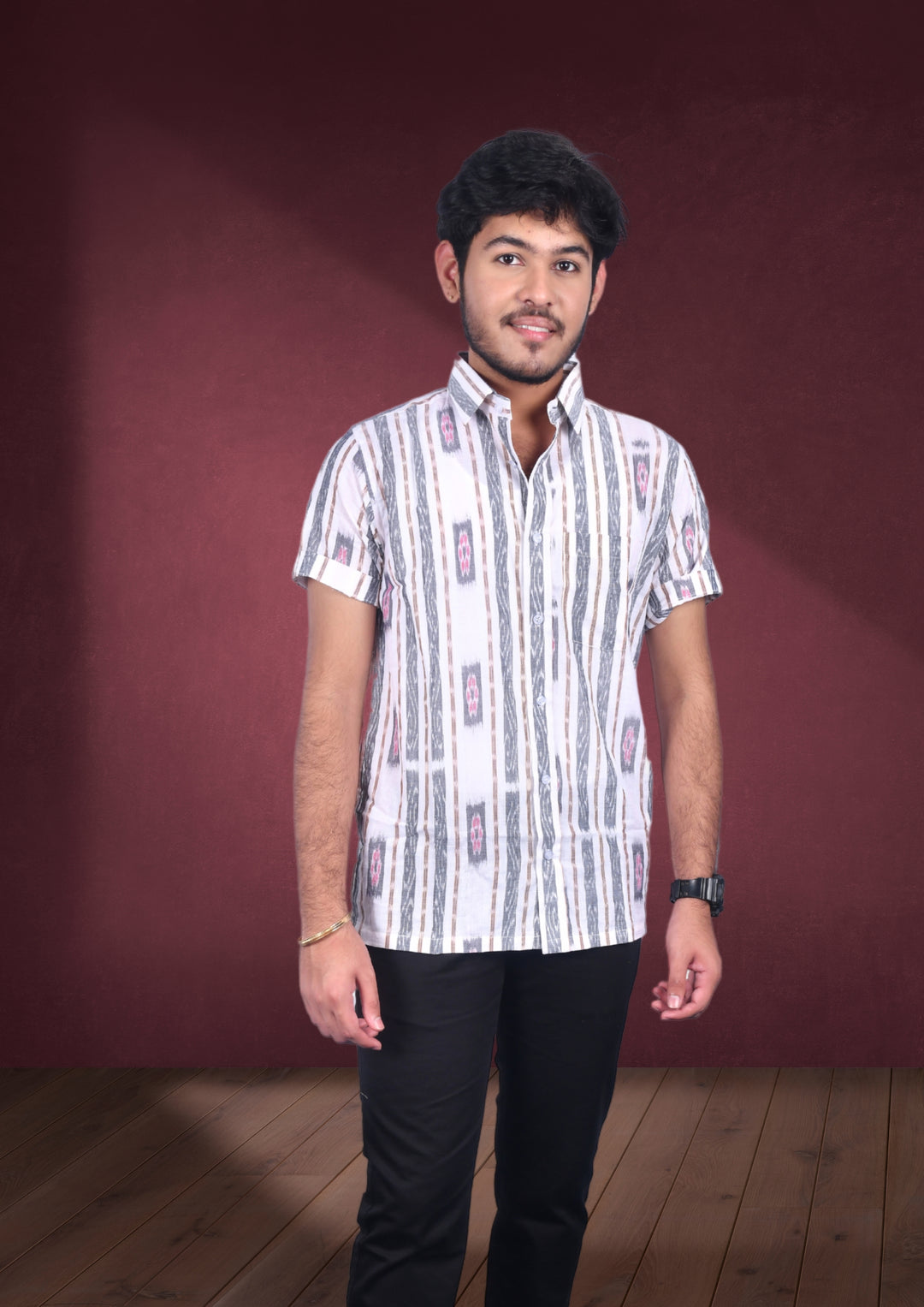 Sambalpuri Hand-woven Men's Half-sleeve Shirt in White & Grey