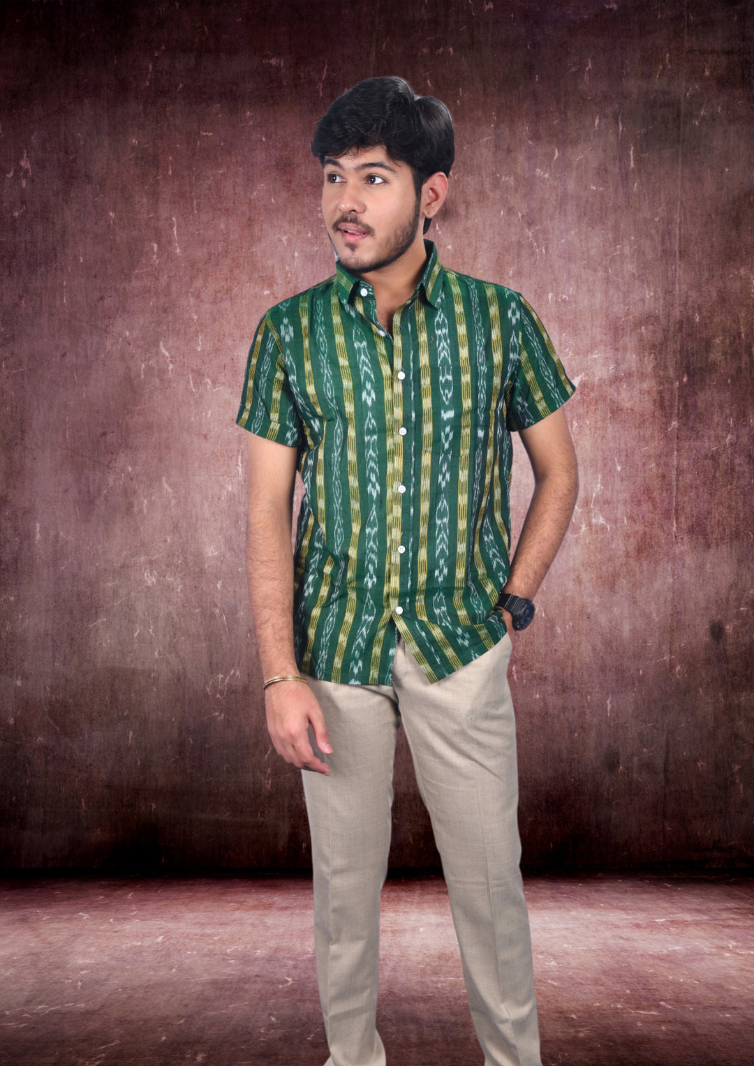 Sambalpuri Handloom Men's Cotton Half-sleeve Shirt in Green