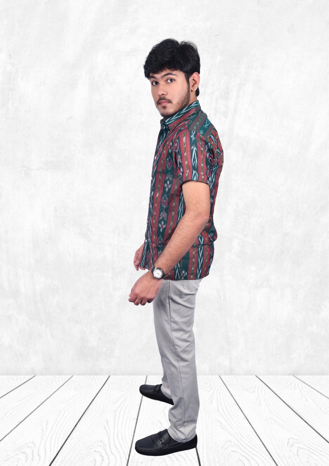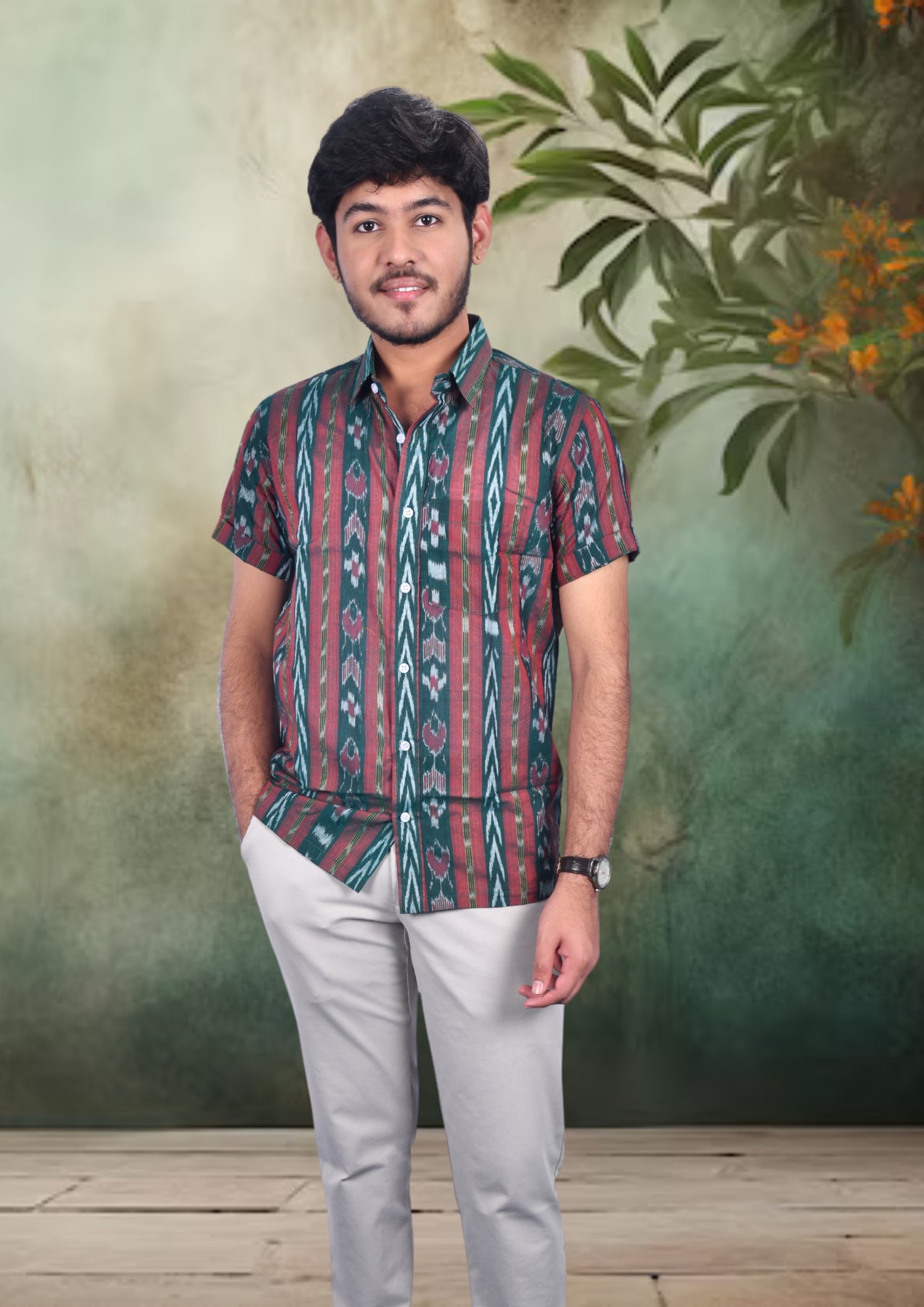 Sambalpuri Handloom Men's Half-sleeve Shirt in Green & Maroon