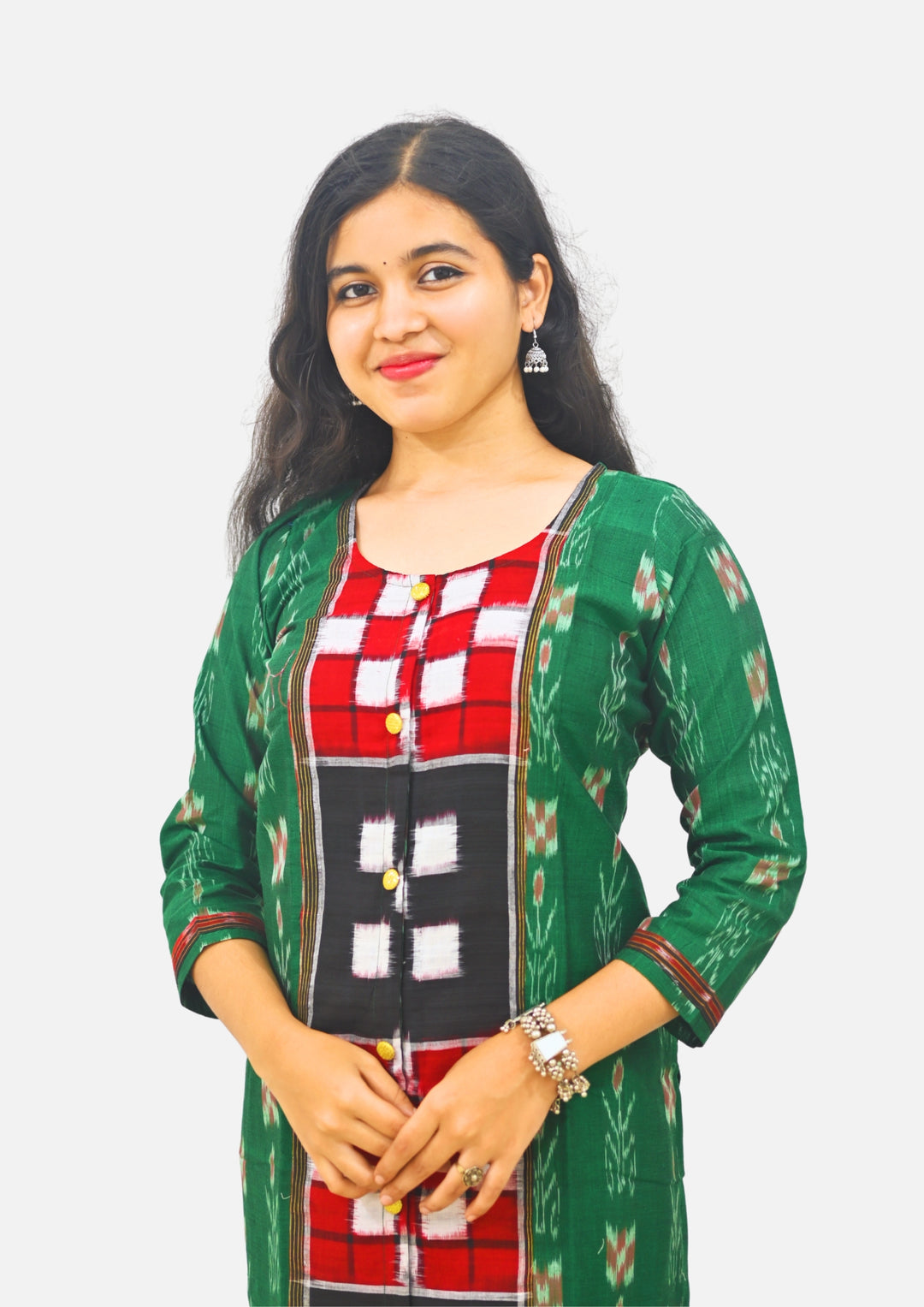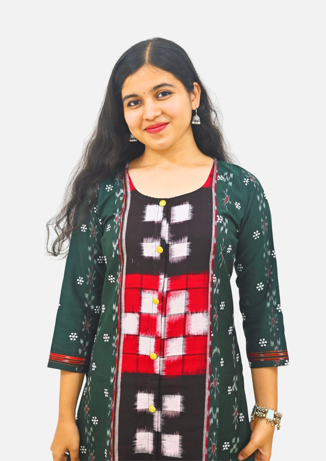 Sambalpuri Women's Kurti – Green with Black, Red, and White Pasapali Ikat Motif