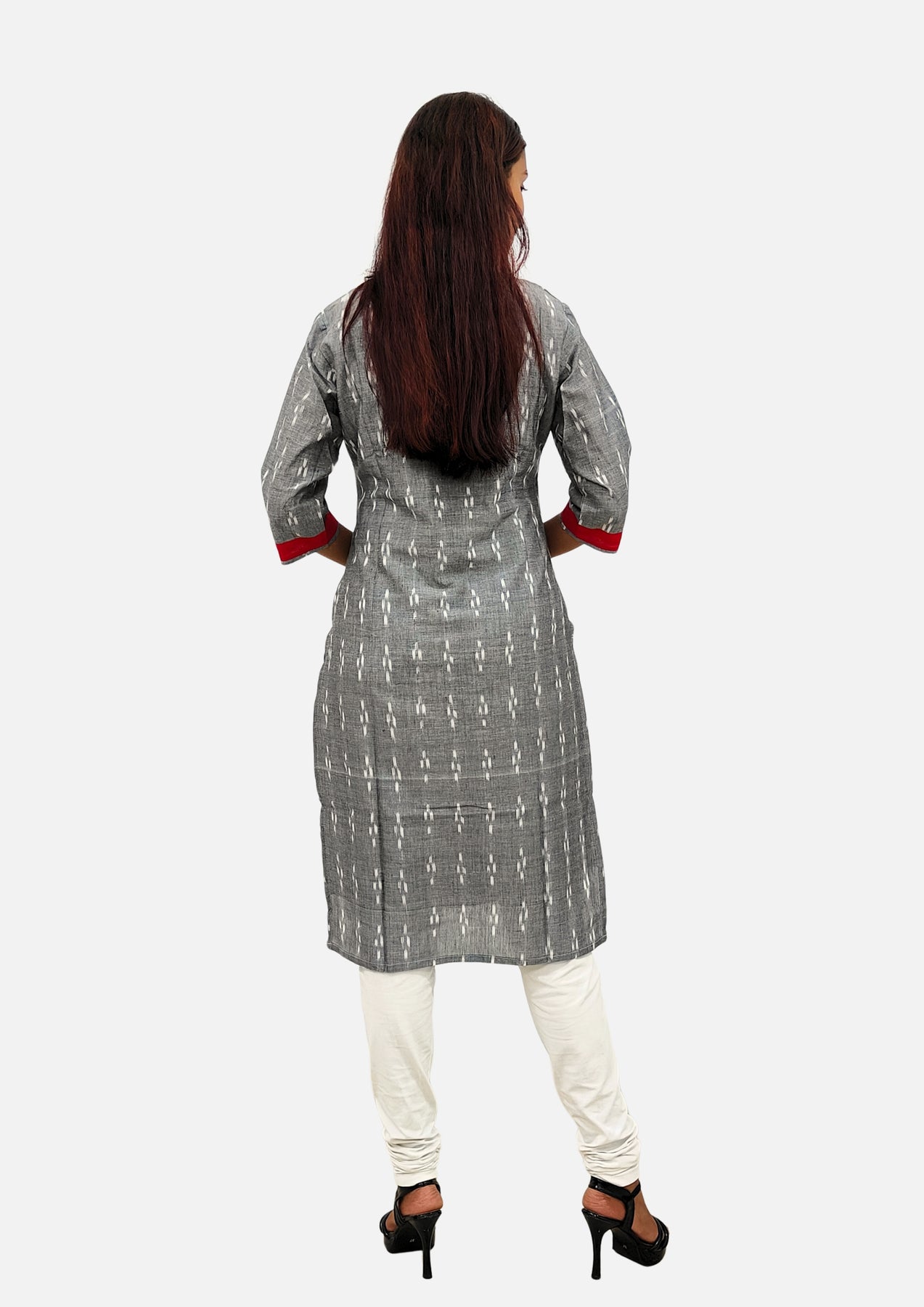Sambalpuri Women's Kurti – Grey with Black, Red, and White Pasapali Ikat Motif