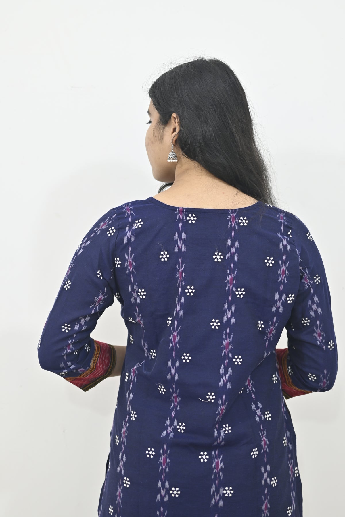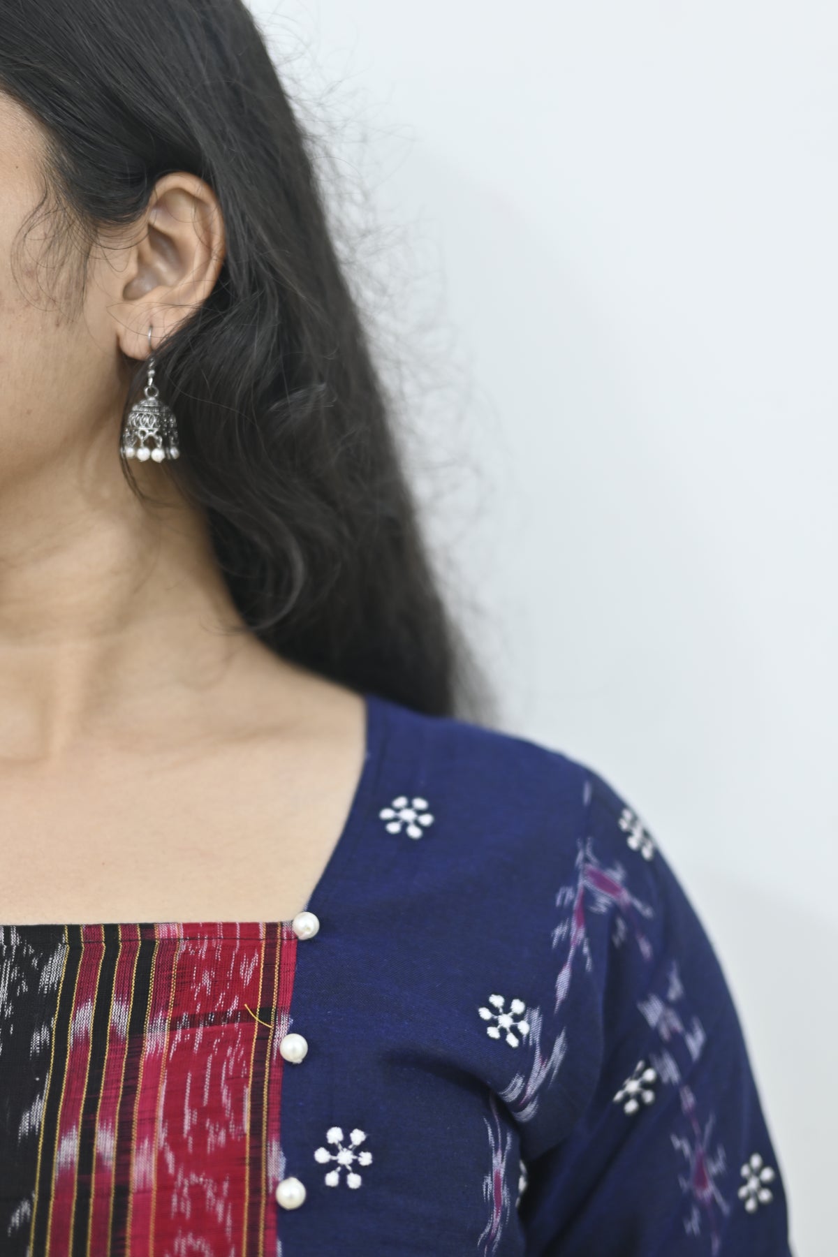 Wovio Modern Ikat Fusion Top D Neck – Blue Base with Mini Dot Motifs & Red–Black